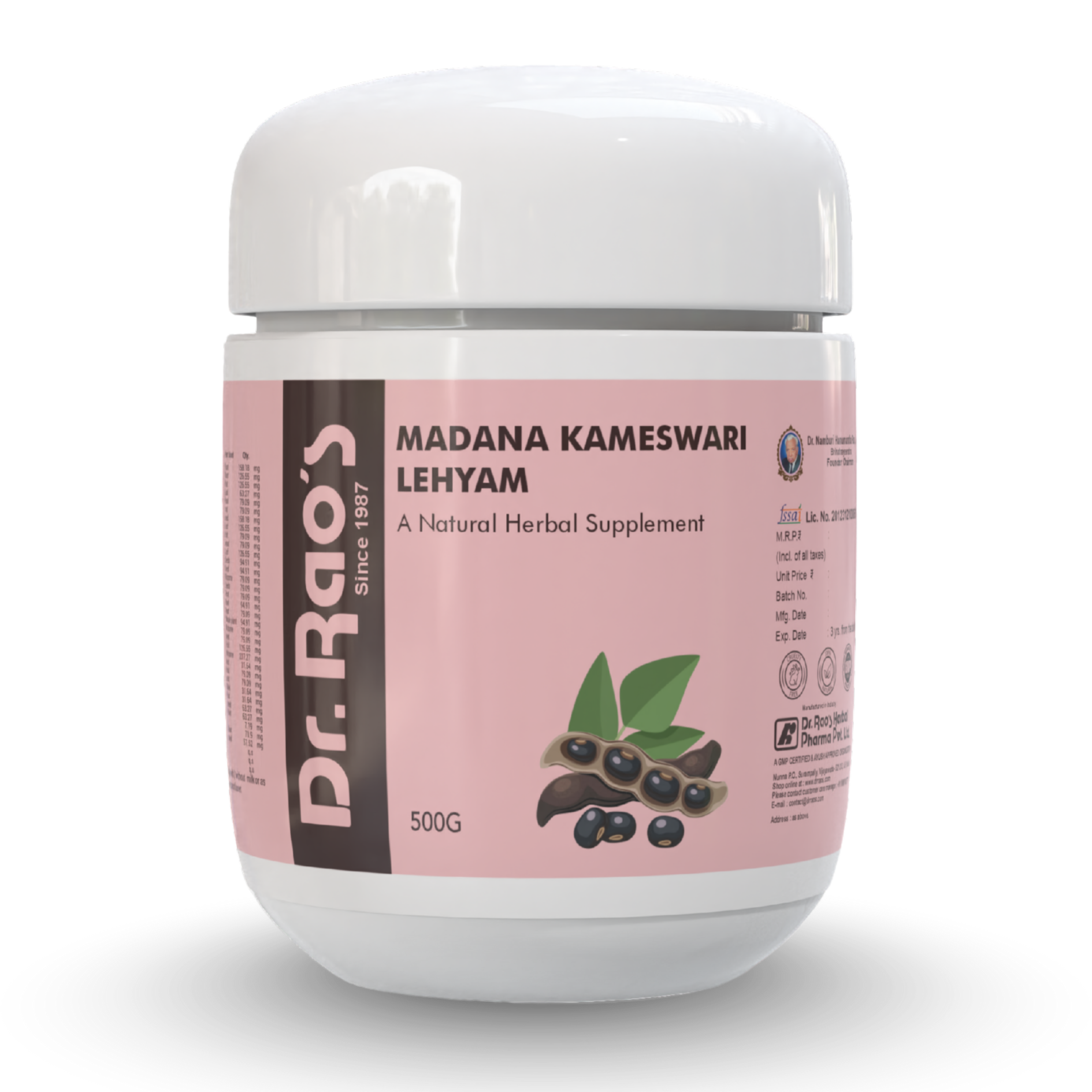 Ashwagandha (Withania somnifera), Shatavari (Asparagus racemosus), Shalamisri (Orchis latifolia), Japatri (Myristica fragrans), Safed Musali (Chlorophytum borivilianum), Akkarakarbha (Anacyclus pyrethrum), Kapikachhu (Mucuna pruriens), Sunamukhi (Cassia angustifolia), Jatiphala (Myristica fragrans), Madhusnuhi (Smilax glabra), Patra (Cinnamomum iners), Black Pepper (Piper nigrum), Cumin (Cuminum cyminum), Chitraka (Plumbago zeylanica), Katchura (Curcuma zedoaria), Musta (Cyperus rotundus), Licorice (Glycyrrhiza glabra), Kushta (Saussurea costus), Giloy (Tinospora cordifolia), Vidari (Ipomoea digitata), Ajwain (Trachyspermum ammi), Amla (Phyllanthus emblica), Sunthi (Zingiber officinale), Pippali (Piper longum), Gokshura (Tribulus terrestris), Jatamansi (Nardostachys jatamansi), Dalchini (Cinnamomum zeylanicum), Lavanga (Syzygium aromaticum), Ela (Elettaria cardamomum), Karkataka Srungi (Pistacia integerrima), Patcha Karpuram (Cinnamomum camphora), Balamoola (Sida cordifolia), Coriander (Coriandrum sativum), Jaggery, Honey, Ghee